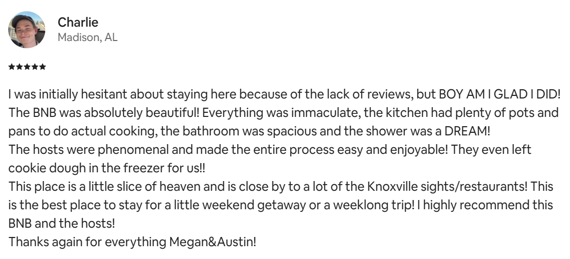 We're Megan and Austin Church — a couple with a deep love for Knoxville and a shared commitment to thoughtful hospitality. Whether you're here for a weekend getaway, a work retreat, or an extended stay, we want you to feel like you’re home (or better).